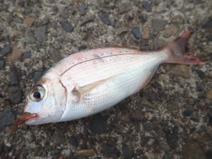| 早速掛かってきたのがチビマダイ。 でも引きはシロギス並みに良いよ(^-^)b ちょい投げしてちょいサビくとほぼコイツ^^; 一方足元ではベラやフグ。 本命は釣れないけど、アタリが多いのは楽しい。 この時期本命はもっと浅場なんだろうな。 |