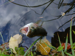 | 流れ込みから離れたポイントでは同じくらいのペースでニジマスも掛かって来る。 |