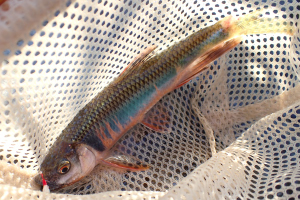 | 川の条件もあるけど、ポイントの選択も釣果に影響しそうだね。 今日は瀬の肩に近い開きかな そして13cmの婚姻色が掛った(^-^)b |