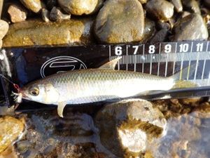 | ”コツ!”っていうアタリも少ないが、まずは前回のポイントでちーさいのが掛かる(^^)b アタリがあまりにもショボいので、本流筋の岸寄りの緩流帯に移動! ヌルの少なめな瀬を見つけ再開。 ここは大き目なアタリが発生する(@_@) よしよし!11cmオーバーの銀色♪ |
