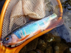 | 曲がった瀬には付かないので、なるべく真っすぐで適度な流速の瀬を狙う! ここで良型を中心に何匹か掛けるが、なんかスリムなのが多いね。。。 そんななか婚姻色がヒット!! デカい、デカい!14cmあるよ(^^)b |