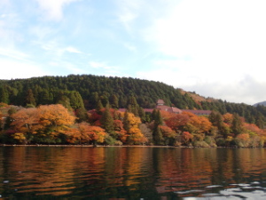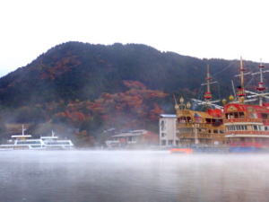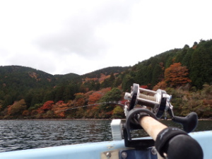 | この時期はあえて紅葉の見頃の天気の良い穏やかな日を狙って来る(^-^)♪ ベタ凪っていうより”ほぼ無風”のスタート。 箱根湾内は観光船航路を中心に所々ワカサギタワーができている。 |
