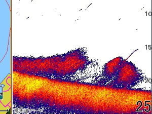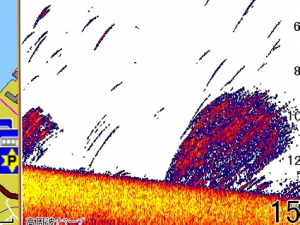 | こちらはワカサギ団子に捕食者が突っ込んだかのような映り方。 |