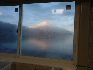 | 4:00出撃!ガソリン入れたりコンビニ寄ったりで湖畔には6:00前到着! まだ暗いけど、東の空はだいぶ白んでる。 6:30にドーム船に乗り込むと、結露した窓ガラス越しに富士山がキレイに見えてる♪ |